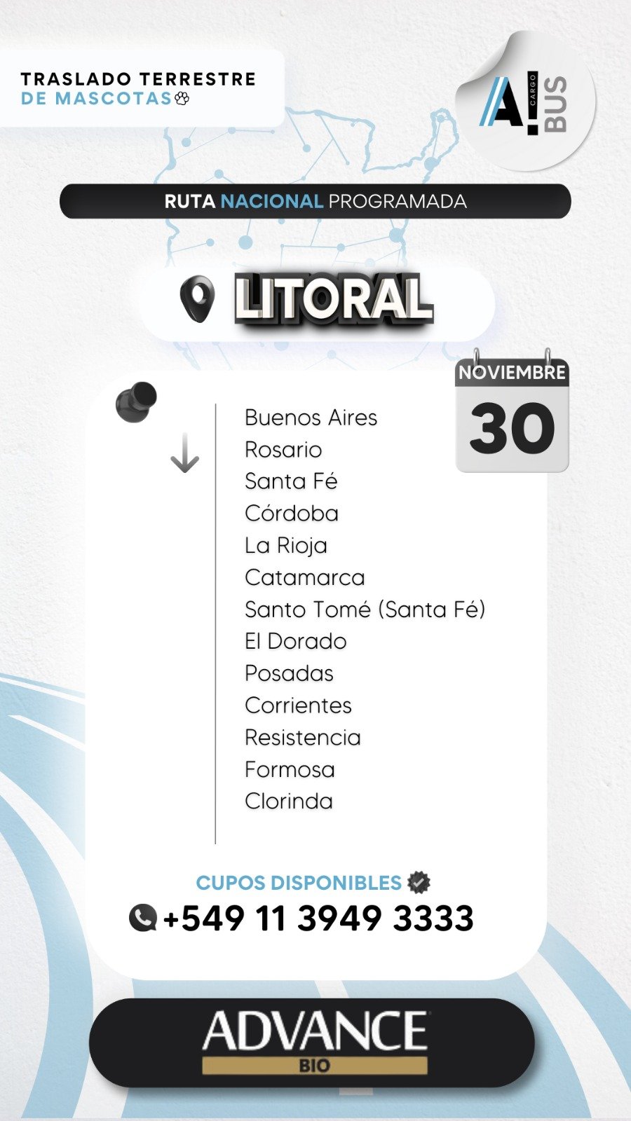 También tenemos una división nacional “Animal Cargo Bus”, con vehículos propios y exclusivamente para mascotas, donde recorremos el interior del país.